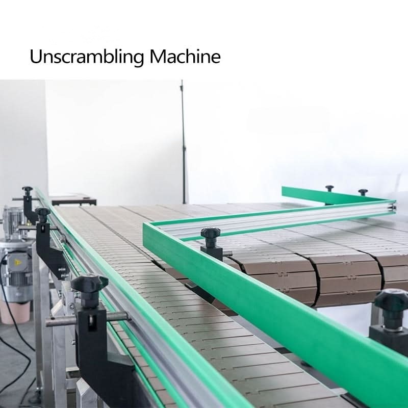 conveyor functions as an efficient bottle unscrambler, streamlining sorting and feeding processes for automated production lines. Its high-capacity design saves labor and ensures consistent throughput when integrated with other machinery.